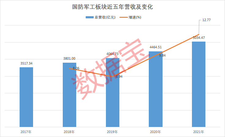 国防军工上演指数估值“双杀”,主要受能源价格上涨、疫情反复等因素持续影响,不过军工板块基本面并未发生大幅转变。数据宝统计,近年来,国防军工板块营收稳健增长,年增速保持在6%以上。2021年,板块营收首次突破5000亿元,年增速达到12.77%,为近五年最高。