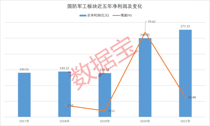净利润方面,国防军工板块表现同样强劲。除2019年外,近五年来板块净利润整体呈现上升势头。尤其是在“十三五”收官的2020年,板块业绩增速高达79.62%,净利润接近250亿元;2021年板块净利润继续稳增10%以上至277.15亿元,较2019年的139.15亿元近翻倍。