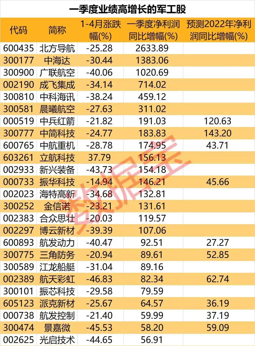 一季度,军工行业重要生产地区西安、东北、成都在经受疫情冲击下,个股表现依然不俗,25股净利润增幅逾50%,16股翻倍。北方导航净利润增幅高达26.34倍,主要系处置子公司确认投资收益所致;中海达、广联航空增幅在10倍以上。从5家以上机构一致预测来看,中简科技、中兵红箭2022全年净利润有望翻倍;航天彩虹、景嘉微和三角防务也有望实现50%以上增长。