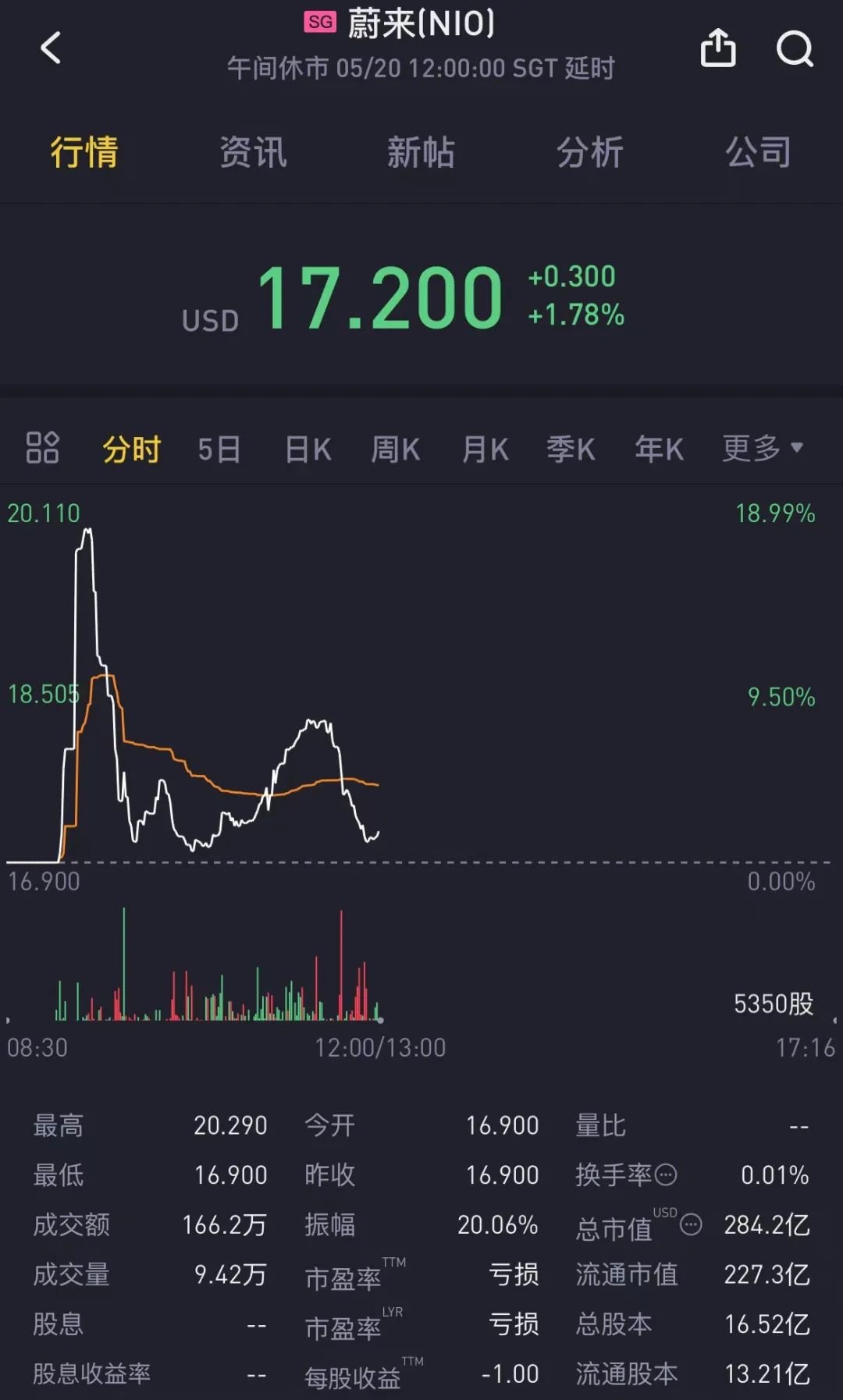 截至新加坡股市午间收盘,蔚来(NIO) 股价报17.20美元/股,涨幅1.78%。