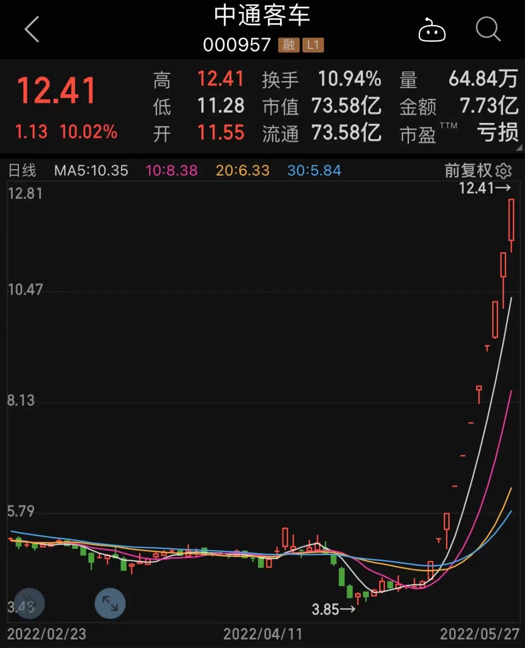 个股方面,中通客车再次涨停,早间收盘仍有13万手买单封板,封板资金达到1.61亿元,该股近期走出11连板走势,累计上涨185.94%。