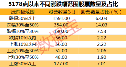 数据宝统计,5178点以来逆势上涨股有333只,占比近11%,涨幅超过50%的个股多达177只,翻倍股多达111只。