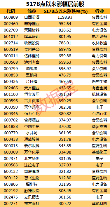 热门赛道股比亚迪、智飞生物、新华制药等5178点以来累计涨幅超过300%。