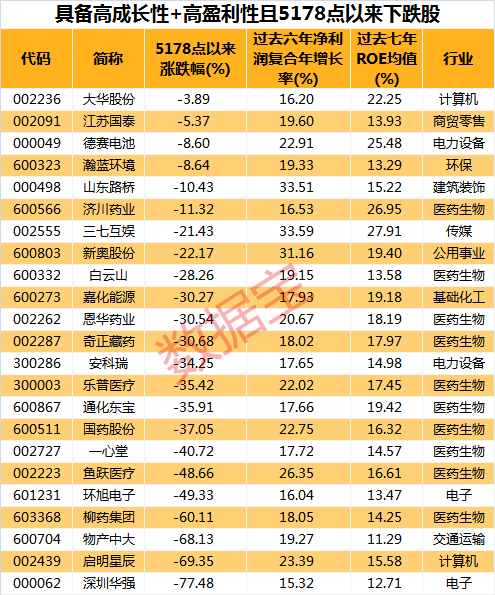 还有哪些个股有反弹机会?数据宝统计,5178点以来股价仍下跌,且过去六年净利润复合增速超过15%,过去七年ROE均超过10%的个股共计23只。医药股数量较多,创业板股仅乐普医疗和安科瑞2只,5178点以来跌幅超过10%的有19只。