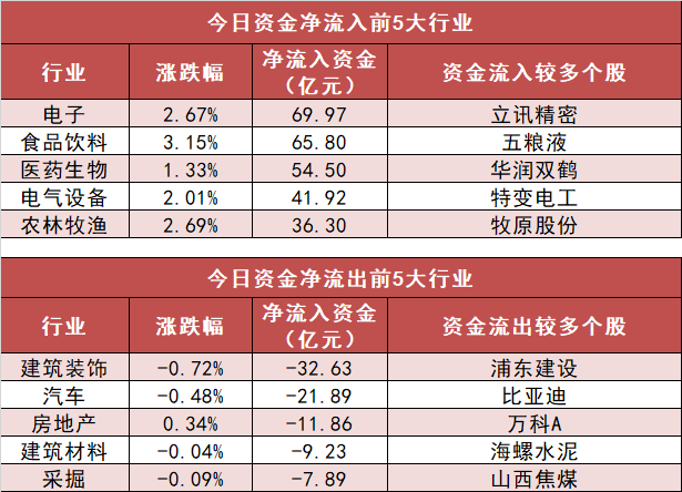 申万一级行业中,15个行业实现资金净流入,其中电子行业净流入69.97亿元居首。