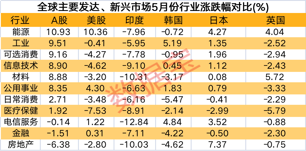从全球来看,5月份行业板块表现两极分化。以中国A股、美股、印度、韩国、日本、英国等发达、新兴市场来看,整体表现较好的是能源、工业,表现一般的有医疗保健、房地产及金融板块。其中A股与韩国股市表现较为接近,与日本股市反差较大。