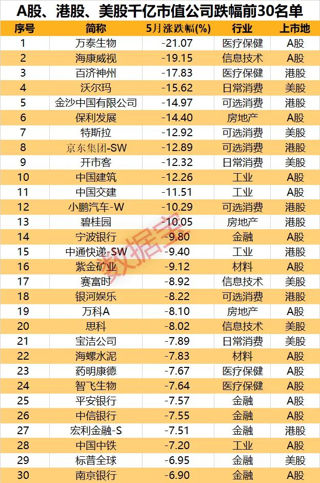 以超千亿市值(原始单位计算,港股为港元,美股为美元,A+H股以A股来计算)的300余家公司来看,A股分化较为明显。涨幅前50和跌幅前30公司中,A股数量均过半,A股万泰生物、海康生物、港股百济神州、美股沃尔玛跌幅居前四位。美股特斯拉、港股京东集团等知名公司跌幅均超过10%,并位居前十以内。