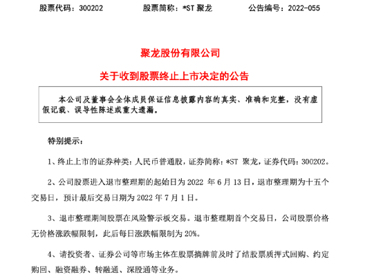 *ST聚龙触及深交所《创业板股票上市规则(2020年12月修订)》第10.3.10条第一款第(三)项规定的股票终止上市情形。根据相关规定以及深交所上市委员会的审核意见,决定*ST聚龙股票终止上市。