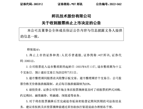 此外,*ST邦讯因2020年度经审计的净利润为负值且营业收入低于1亿元、期末净资产为负值以及2020年度财务会计报告被出具无法表示意见的审计报告,公司股票交易自2021年4月29日起被实施退市风险警示。今年,*ST邦讯未能在法定期限内披露2021年年度报告,触及深交所相关规定的股票终止上市情形,深交所决定*ST邦讯股票终止上市。