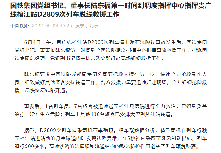 6月4日上午,贵广线榕江站D2809次列车撞上泥石流脱线事故发生后,国铁集团党组书记、董事长陆东福第一时间到全国铁路调度指挥中心指挥事故救援工作,指派国铁集团总经理、党组副书记杨宇栋带队立即赶赴现场组织救援工作。