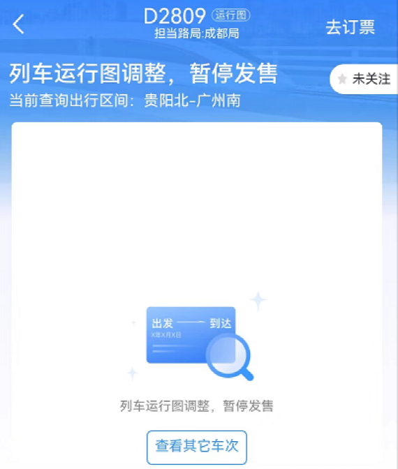 受D2809事故影响 贵阳北站开往广州动车停运。据贵阳高铁工务段,受事故影响,贵阳北站开往广州的动车全部停运,广州至贵阳方向的动车全部停靠晚点。目前在12306的APP上,D2809的列车信息已无法显示。