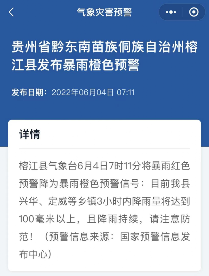 根据国家预警信息发布中心信息,榕江县今晨连续发布了暴雨橙色预警、大雾黄色预警、雷电黄色预警信号。贵州榕江县6月4日有暴雨和大雾预警,相对湿度94%,过去24小时总降水量94mm,4日白天为中雨。