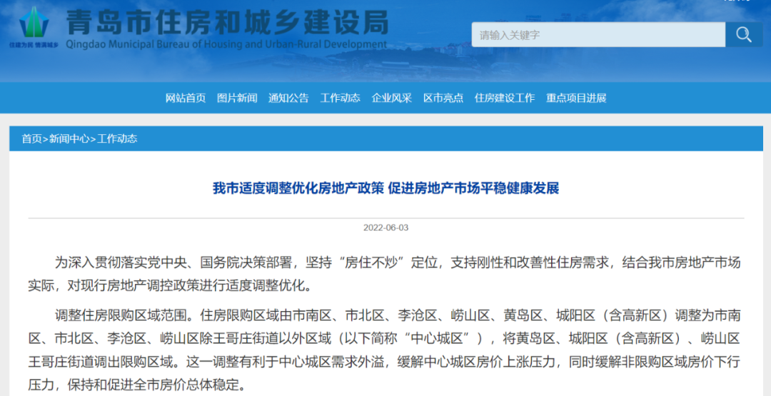 6月3日,青岛市对现行房地产调控政策进行适度调整优化,包括调整住房限购区域范围、优化非本市户籍居民家庭购房条件、支持改善性住房需求等。