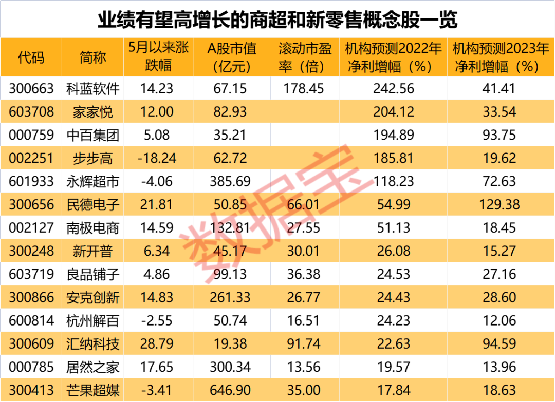 稳经济一揽子政策集中推出,各项刺激消费政策批量出炉,商超及新零售业绩有望迎来大幅改善。数据宝推出《赢在底部》系列之商超篇,梳理有高增长预期的概念股。