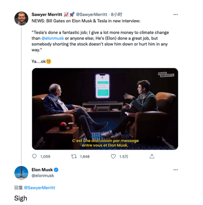 马斯克随后在报道盖茨这一采访的推文下回复称:“哎!”。
