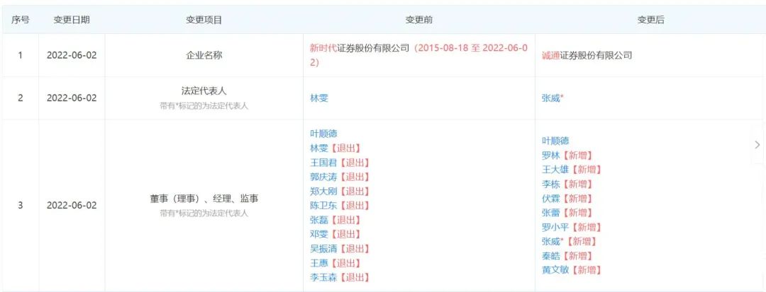 记者今日获悉,新时代证券已更名为诚通证券。与此同时,新时代证券部分原高管人员也发生了变更。诚通证券目前的法人代表为张威,张威今年5月以来任新时代证券董事长。与此同时,原新时代证券一共有10人退出了董监高序列。另有9位新人新加入了诚通证券董监高序列。中证协信息显示,叶顺德此前为新时代证券董事长兼总经理,目前,叶顺德仍在诚通证券董监高团队。