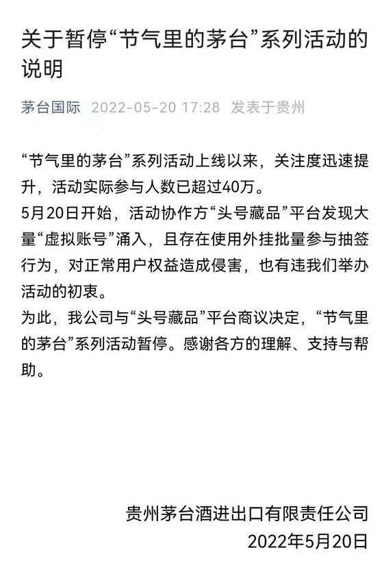 5月20日下午,茅台国际官微发布《关于暂停“节气里的茅台”系列活动的说明》,宣布暂停一天前发布的“节气里的茅台”数字藏品系列活动。公告表示,“节气里的茅台”系列活动上线以来,关注度迅速提升,活动实际参与人数已超过40万,5月20日当天开始,活动协作方“头号藏品”平台发现大量“虚拟账号”涌入,且存在使用外挂批量参与抽签行为,对正常用户权益造成侵害,有违举办活动的初衷。为此,经与平台商议决定,“节气里的茅台”系列活动暂停。