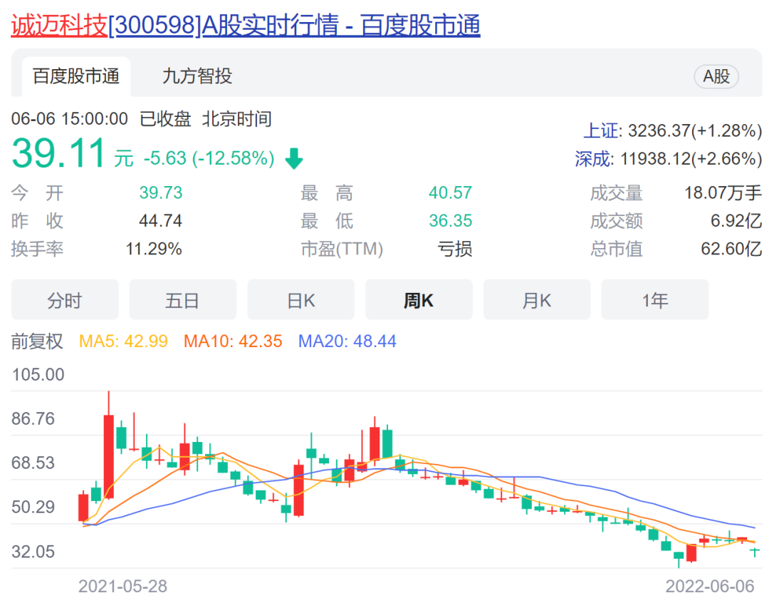 受上述消息影响,诚迈科技股价开盘跳水,最大跌幅超过18%,最终收盘跌幅为12.58%,最新股价为39.11元/股,总市值跌至63亿元,从2020年3月股价“巅峰”至今已经缩水超七成。