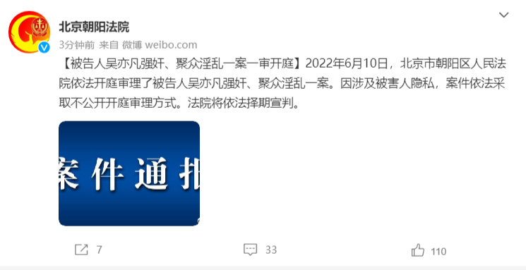据北京朝阳法院消息,2022年6月10日,北京市朝阳区人民法院依法开庭审理了被告人吴亦凡强奸、聚众淫乱一案。因涉及被害人隐私,案件依法采取不公开开庭审理方式。法院将依法择期宣判。