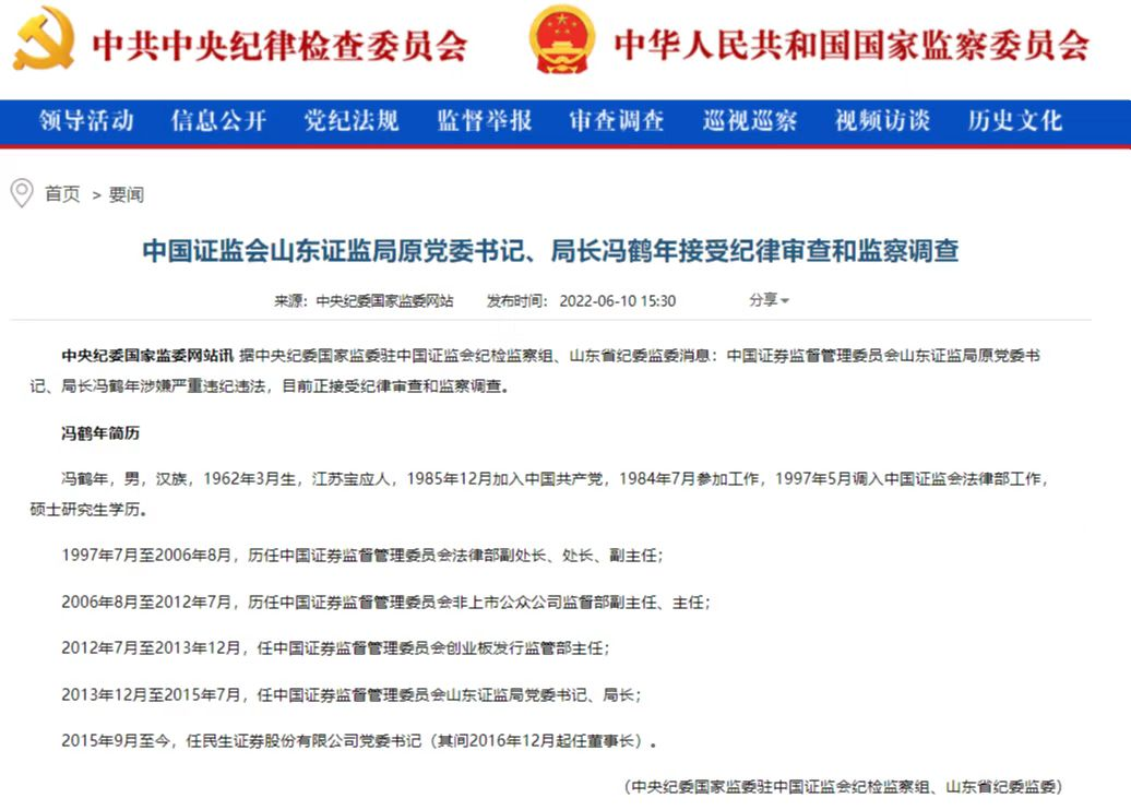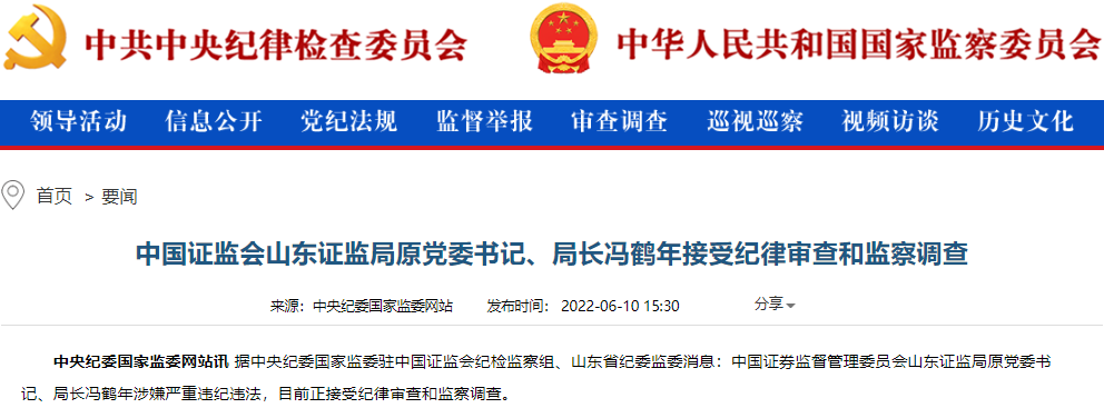 6月10日,中央纪委国家监委网站显示,据中央纪委国家监委驻中国证监会纪检监察组、山东省纪委监委消息:中国证券监督管理委员会山东证监局原党委书记、局长冯鹤年涉嫌严重违纪违法,目前正接受纪律审查和监察调查。