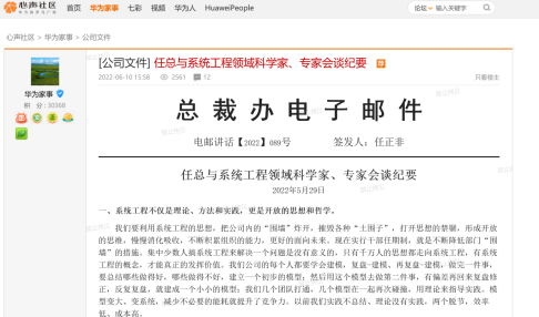 6月10日,华为心声社区最新披露了名为《任总与系统工程领域科学家、专家会谈纪要》的公司文件,这份文件体现了任正非对科学研究、华为天才少年、系统工程、工业互联网等多方面的思考。