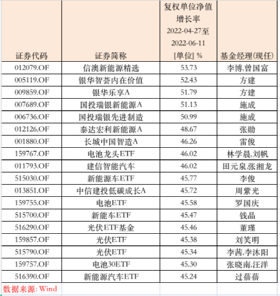 具体来看,李博、曾国富管理的信澳新能源精选以53.73%的涨幅暂居第一。截至一季度末,该基金股票资产规模为35.11亿元,占基金总资产比例93.85%,前十大重仓股中,有比亚迪、天齐锂业、盐湖股份、赣锋锂业等和新能源相关行业龙头。在多只区间涨幅超过50%的基金中,包括方建管理的银华智荟内在价值和银华乐享A、施成管理的国投瑞银新能源A、国投瑞银先进制造等,截至一季度末,均重仓了相关新能源个股。此外,崔宸龙管理的前海开源新兴产业A、曹春林管理的创金合信新能源汽车A、过蓓蓓管理的新能源车LOF等也均实现了超40%的“回血”,陆彬管理的汇丰晋信低碳先锋A近一个月来涨幅也达38%。