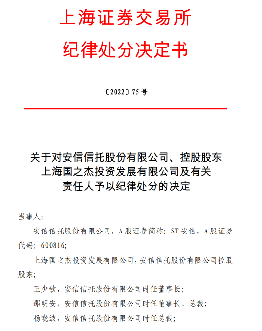 《纪律处分决定书》当事人具体包括:安信信托、上海国之杰投资发展有限公司(安信信托控股股东)、安信信托两任董事长王少钦及邵明安、安信信托两任总裁杨晓波及王荣武、安信信托时任主管会计工作负责人赵宝英,安信信托三任董事会秘书武国建、陶瑾宇及王岗。