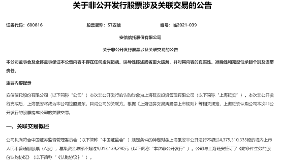 2021年7月份,安信信托披露《非公开发行股票预案》,安信信托拟向上海砥安投资管理有限公司(以下简称“上海砥安”)实施非公开发行股票,发行价格为2.06元/股,非公开发行的股票数量不超过43.75亿股,募集资金不超过90.13亿元,扣除相关发行费用后,全部用于充实公司资本金。此次非公开发行完成后,上海砥安将成为公司控股股东,持股比例为44.44%。