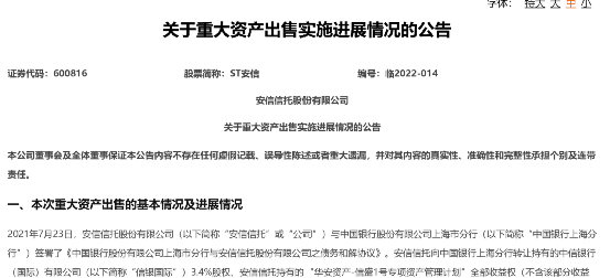 今年3月9日,安信信托发布《关于重大资产出售实施进展情况的公告》,披露了其与中国银行上海分行的债务和解进展。具体来看,相关重大资产出售的后续工作安排分为三方面:其一,对于信银国际3.4%股权的交易,待信银国际完成相应决策程序及获得香港监管部门批复(如需)后,公司将尽快与中国银行上海分行完成资产交割;其二,就本次交易中存在权利限制情形的置出资产,待查封冻结机构解除权利限制后,公司将尽快与中国银行上海分行完成资产交割;其三,对于其他不存在权利限制的标的资产,公司正在与交易对手协商办理相关资产交割手续。
