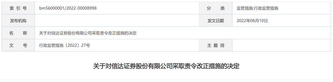 根据《证券公司监督管理条例》第七十条和《境外办法》第三十二条的规定,证监会决定对信达证券采取责令改正的措施,信达证券需要在收到上述决定之日起3个月内,向北京证监局提交整改报告。