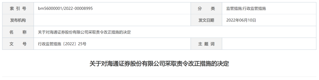 根据《证券公司监督管理条例》第七十条和《境外办法》第三十二条的规定,证监会决定对海通证券采取责令改正的措施,海通证券需要在收到上述决定之日起3个月内,向上海证监局提交整改报告。