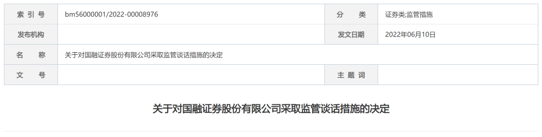 按照《重组办法》第五十八条、《财务顾问办法》第三十九条的规定,证监会决定对国融证券采取监管谈话的行政监管措施。