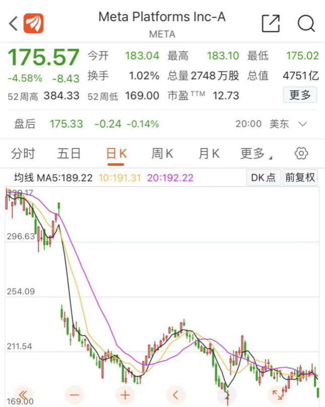 叠加主营广告业务也出现增长疲态,这使得Meta公司股价重挫。今年2月份,受到2021年第四季度业绩报告中的疲软业绩指引影响,Meta股价暴跌超20%,此后,在美联储收紧货币政策的大环境影响下,公司股价继续下跌。与年初相比,Meta目前股价已接近腰斩。截至最新交易日,报175.57美元/股,总市值为4751.49亿美元(约合人民币3.19万亿元)。