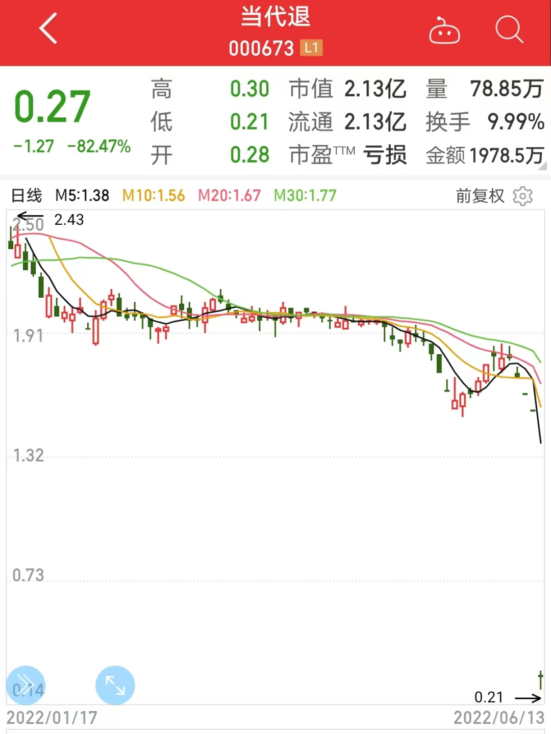 当代退跌幅82.47%排在第一位,该股最新股价仅0.27元/股,A股市值跌到只剩2.13亿元。截至今年第一季度末,公司股东户数2.4万户。在2015年历史高点时期,公司市值一度达到182亿,如今七年时间过去,市值蒸发逾180亿元。