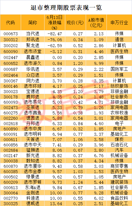 今年以来,A股退市常态化,退市股数量猛增。证券时报·数据宝统计,目前有超过30股处于退市整理期。6月13日,退市整理期第一天的三只股票聚龙退、邦讯退、当代退均跌超60%,且创下历史新低。