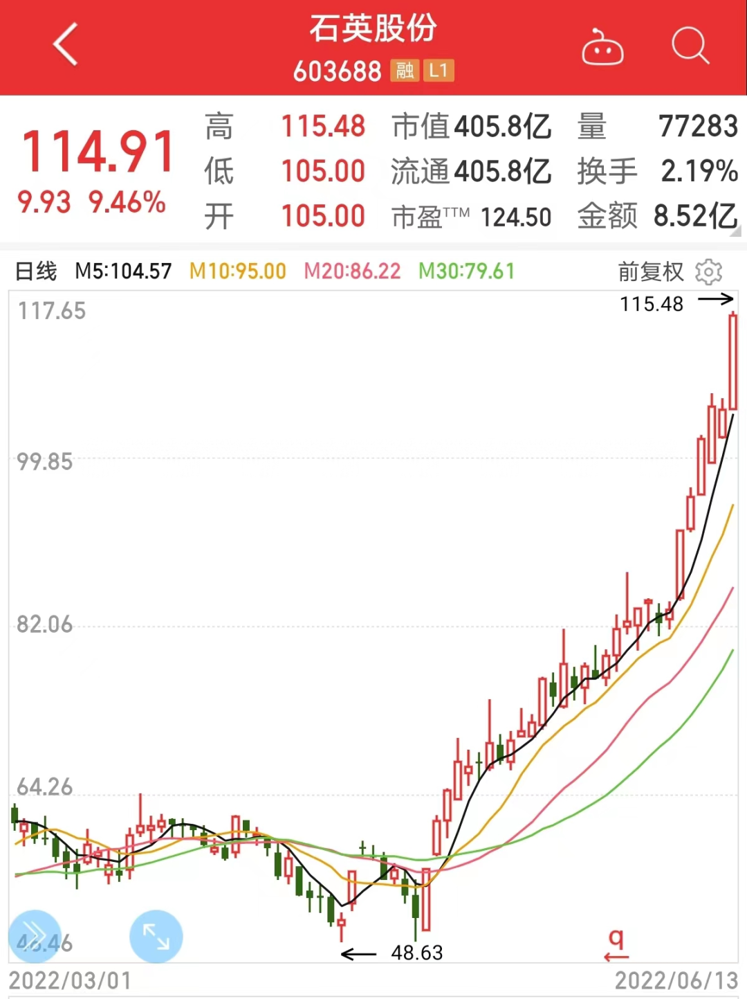 6月13日早盘,石英股份盘中冲击涨停板,历史最高价由此提升至115.48元/股。自4月27日上证指数阶段新低反弹以来,石英股份一路上扬,6月8日,公司股价罕见历史性突破百元大关。截至今日收盘,公司股价报收114.91元/股,A股市值突破400亿元,近一个半月时间反弹幅度翻倍。