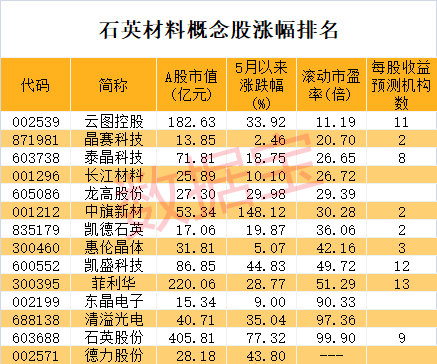 数据宝统计,A股市场上具备石英材料相关业务的公司有14家。5月以来概念股全线上涨,平均涨幅高达36.22%,远超同期沪深300指数。中旗新材今日股价涨停,最新收盘价创历史新高,5月以来累计涨幅148.12%排在首位。