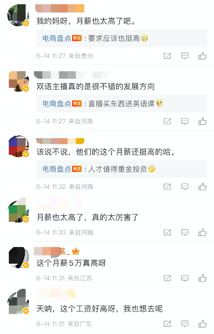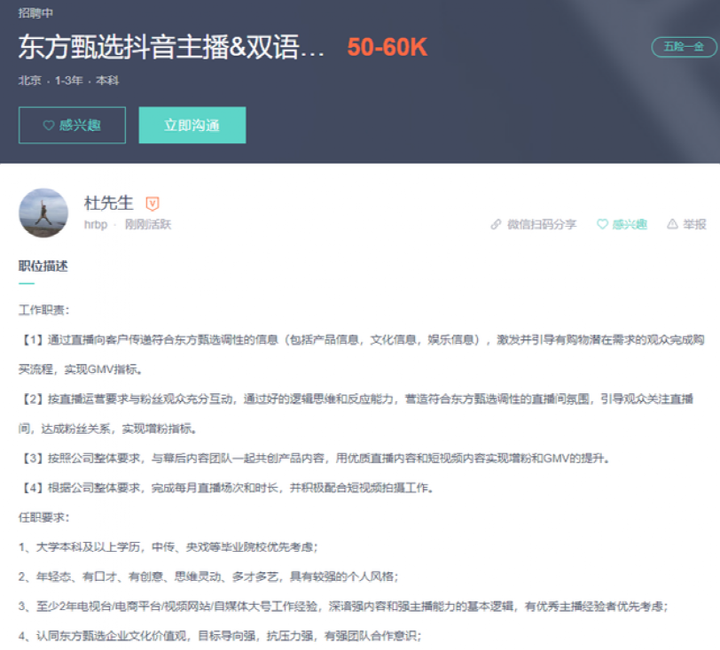 BOSS直聘职位分析师单恭向媒体指出,东方甄选直播的特色是双语主播,在平台上的招聘薪资是50K-60K;其他公司也有在招聘相近的岗位,如“双语主播”“外语主播”,薪资为10K-50K不等,主要受限于地区、行业等因素,一二线城市、传统消费品行业给出的待遇相对更高,“大部分公司招聘双语主播、外语主播都是为了拓宽外贸业务”。