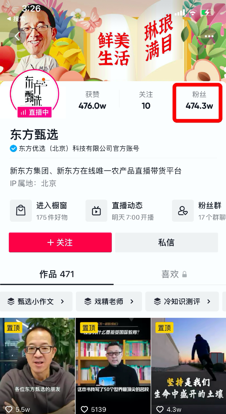 截至发稿,东方甄选抖音平台粉丝已经升至474.3万,东方甄选在抖音平台带货榜上位列第四。