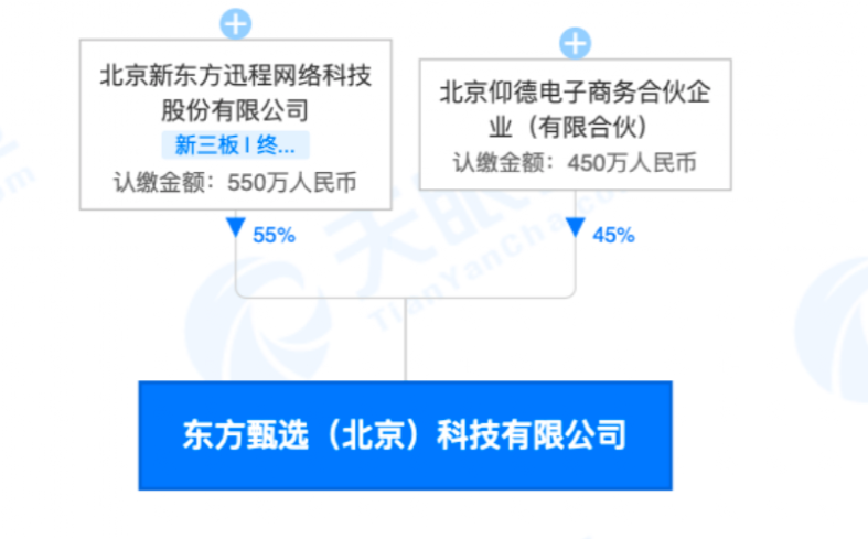 天眼查App显示,“东方甄选”关联公司东方优选(北京)科技有限公司成立于2021年10月,法定代表人为孙东旭,经营范围含食品互联网销售;网络文化经营;演出经纪等,由北京新东方迅程网络科技股份有限公司全资持股。