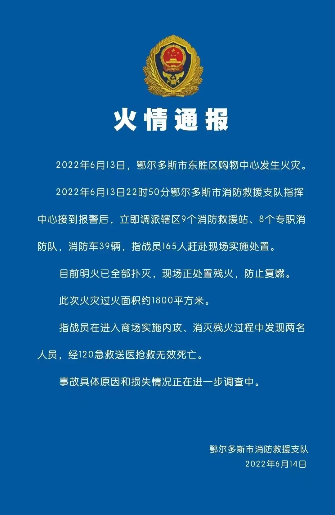 鄂尔多斯市公安局东胜分局6月14日发布的警情通报显示,2022年6月13日23时许,东胜区鄂尔多斯购物中心发生一起火灾,起火处为一楼底商一手机店。