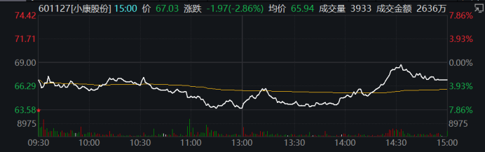 6月14日当日,在汽车整车板块集体飘红的情况下,小康股份(601127)股价下挫,报收67.03元/股,跌幅2.86%,最新市值911.6亿元。