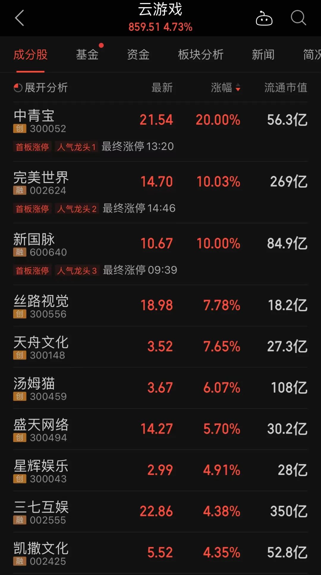 今天A股市场强势震荡,两大科创指数逆势走强,创业板指涨0.4%,科创50指数涨1.53%。板块方面,云游戏板块涨逾4%位居行业涨幅榜前列。其中,中青宝“20CM”涨停,完美世界、新国脉等个股涨停。