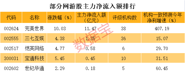 龙头已崛起,不排除板块中其他个股也会乘势而起。证券时报·数据宝统计,板块中完美世界、三七互娱、吉比特等股均有30家以上机构评级,宝通科技、姚记科技、电魂网络等股有5家以上机构评级。