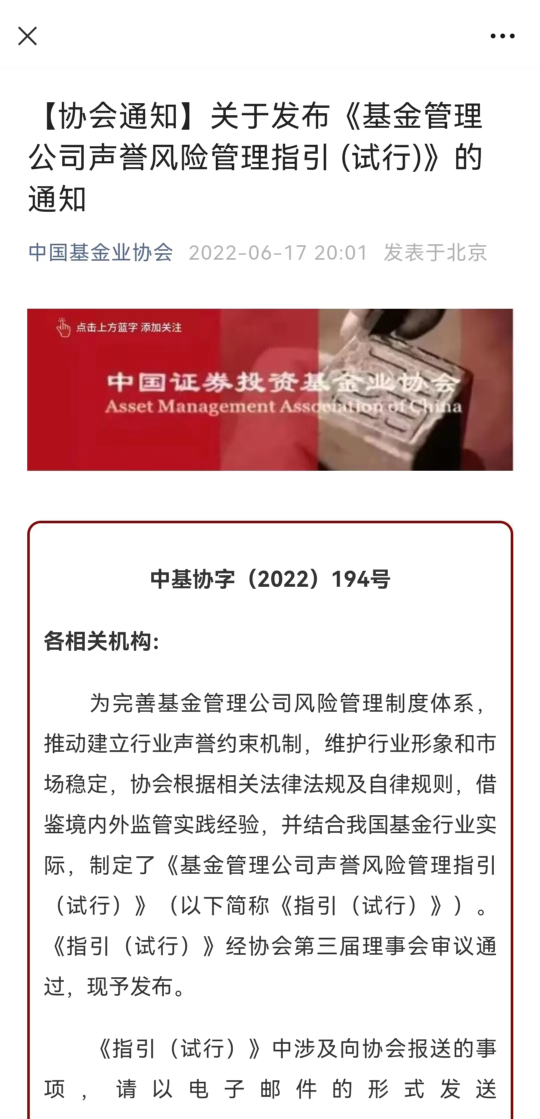 6月17日,中国证券投资基金业协会发布消息,为完善基金管理公司风险管理制度体系,推动建立行业声誉约束机制,维护行业形象和市场稳定,协会根据相关法律法规及自律规则,借鉴境内外监管实践经验,并结合我国基金行业实际,制定了《基金管理公司声誉风险管理指引(试行)》(以下简称“指引”)。