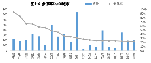 从省份维度来看,东南部沿海及西南部地区参保率较高,其中浙江省的参保率最高,直辖市包括上海沪惠保、北京普惠健康保、重庆渝快保也有较高的参保人数。