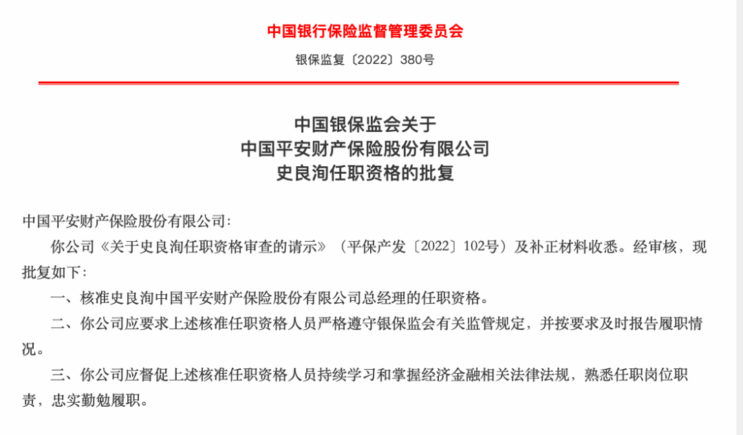继上月平安人寿董事长杨铮任职资格获批后,平安产险史良洵的总经理任职资格也于近日获批。
