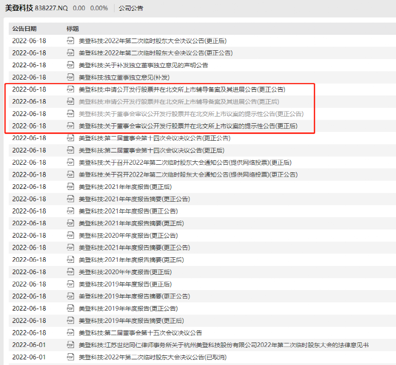 新三板公司美登科技,6月18日发布一系列更正公告,包括申请北交所上市辅导备案更正相关公告。这只准备进军北交所的股票,在今年上演了一出“惊天”股价表演。