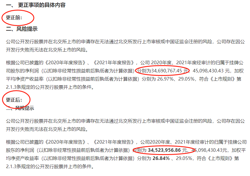 6月18日,美登科技发布一系列更正公告,其中就包括申请北交所上市相关公告。在上市辅导备案及其进展相关公告中,2020年的净利润由3469万元更正为3452万元。