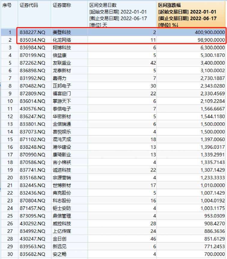 美登科技年初股价才0.01元,今年以来只有2天的交易,直接涨到40.1元,涨幅高达4009倍。期间成交才3.2万元。